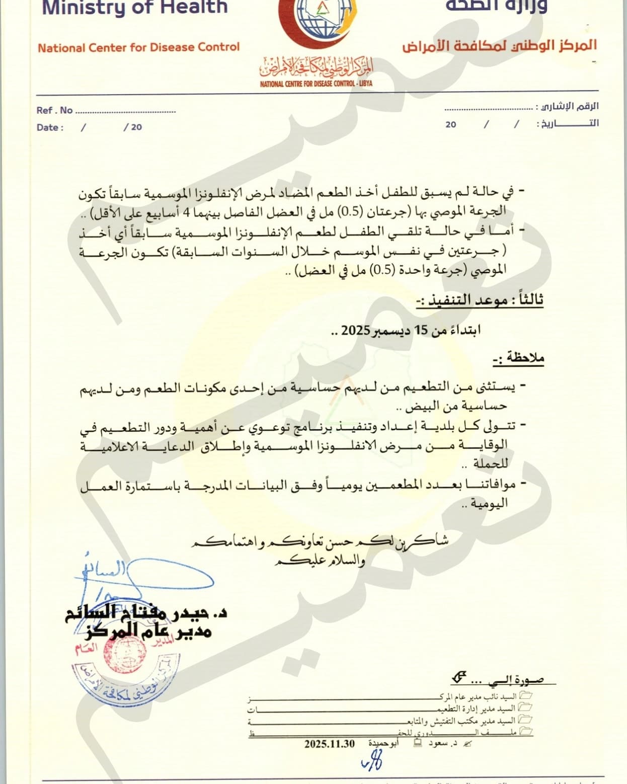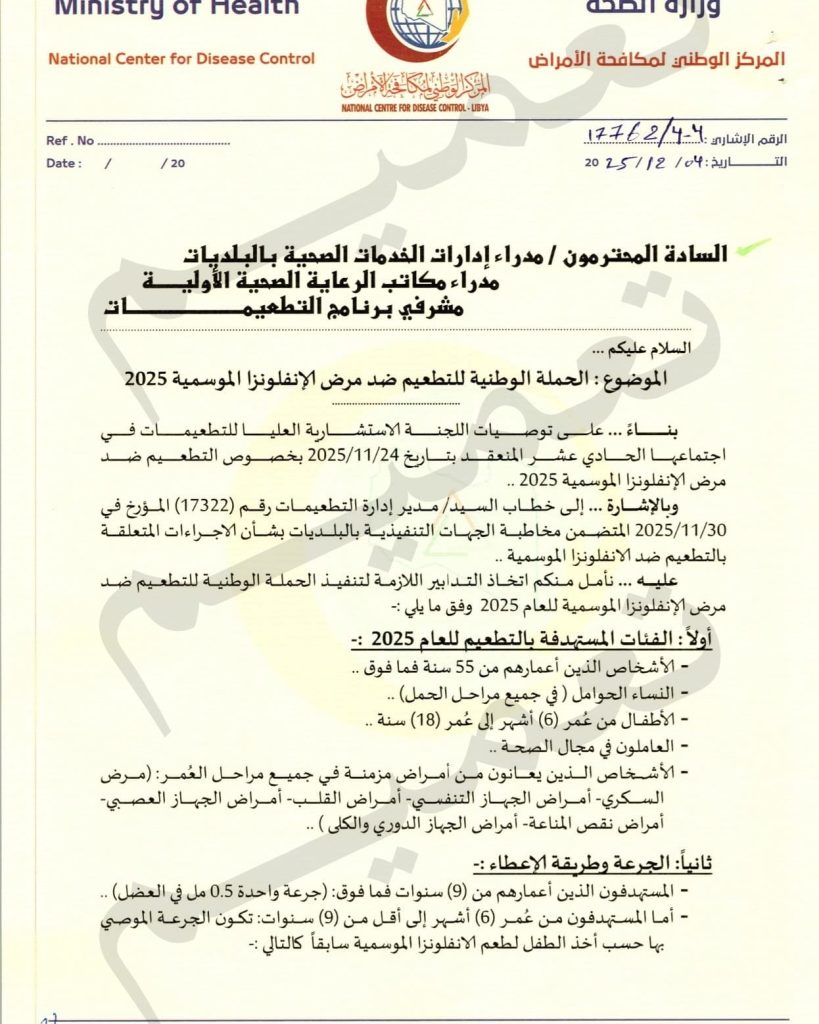 بناء على توصيات اللجنة الاستشارية العليا للتطعيمات بخصوص التطعيم ضد مرض الانفلونز الموسمية ، تنطلق ابتداء من تاريخ 15 ديسمبر 2025 الحملة الوطنية للتطعيم ضد مرض الإنفلونزا الموسمية 2025 في جميع مراكز التطعيم بالبلديات.